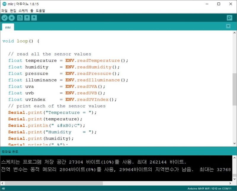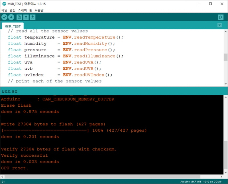 컴파일이 이상없이 완료되면 스케치>업로드(CTRL+U) 를 선택해서 컴파일 파일을 업로드 한다.