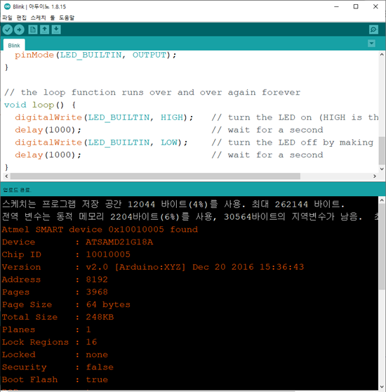 다음과 같이 컴파일후 업로드를 한다. 화면에 LED가 깜빡이는 것을 확인할 수 있다.