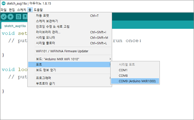 자동으로 드라이브가 완료되면, 툴>보드>에서 Arduino MKR1000을 설정한다.